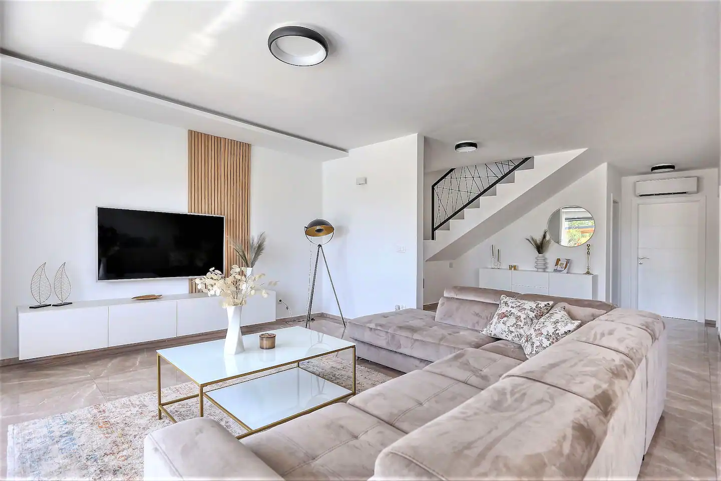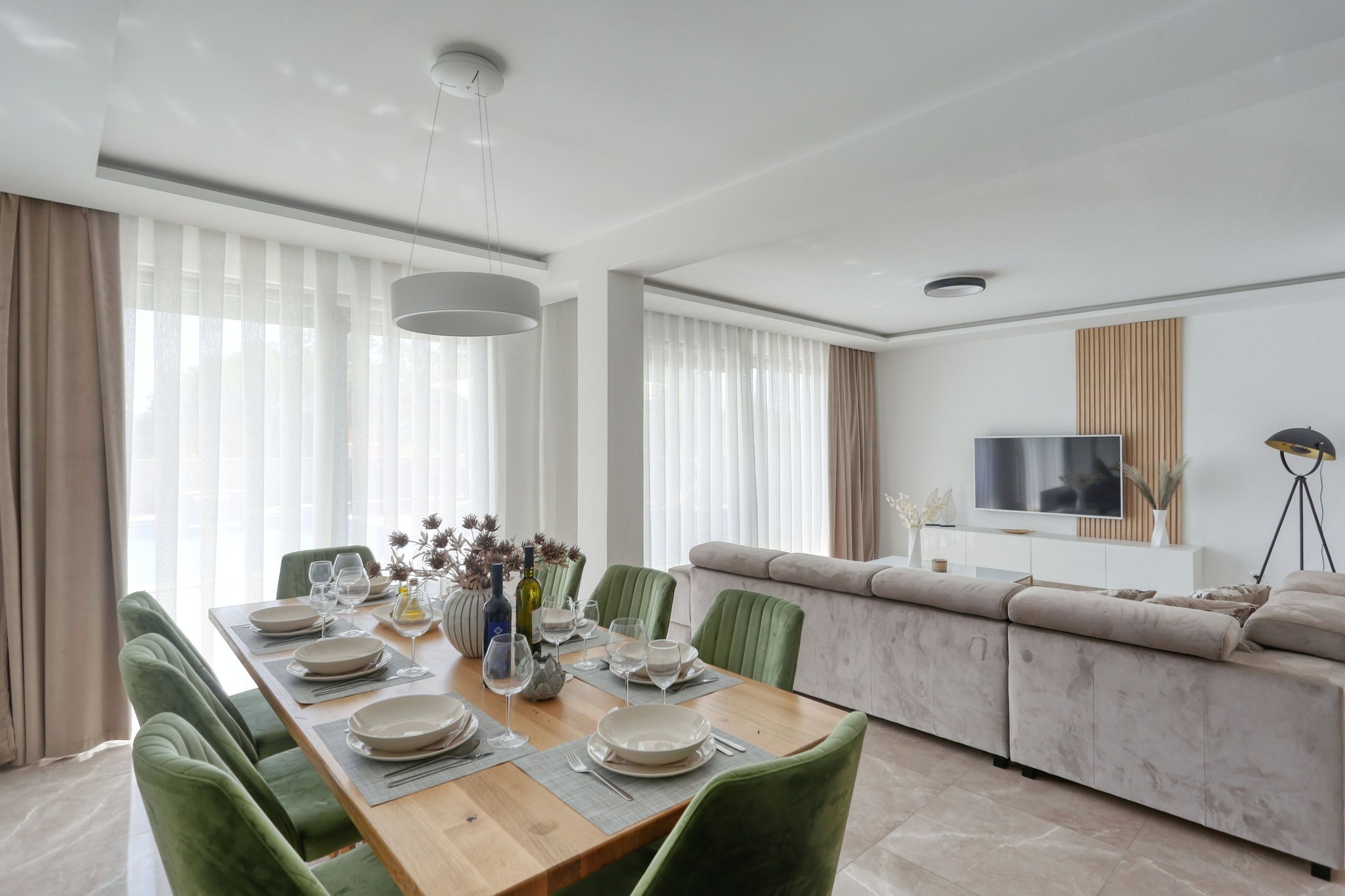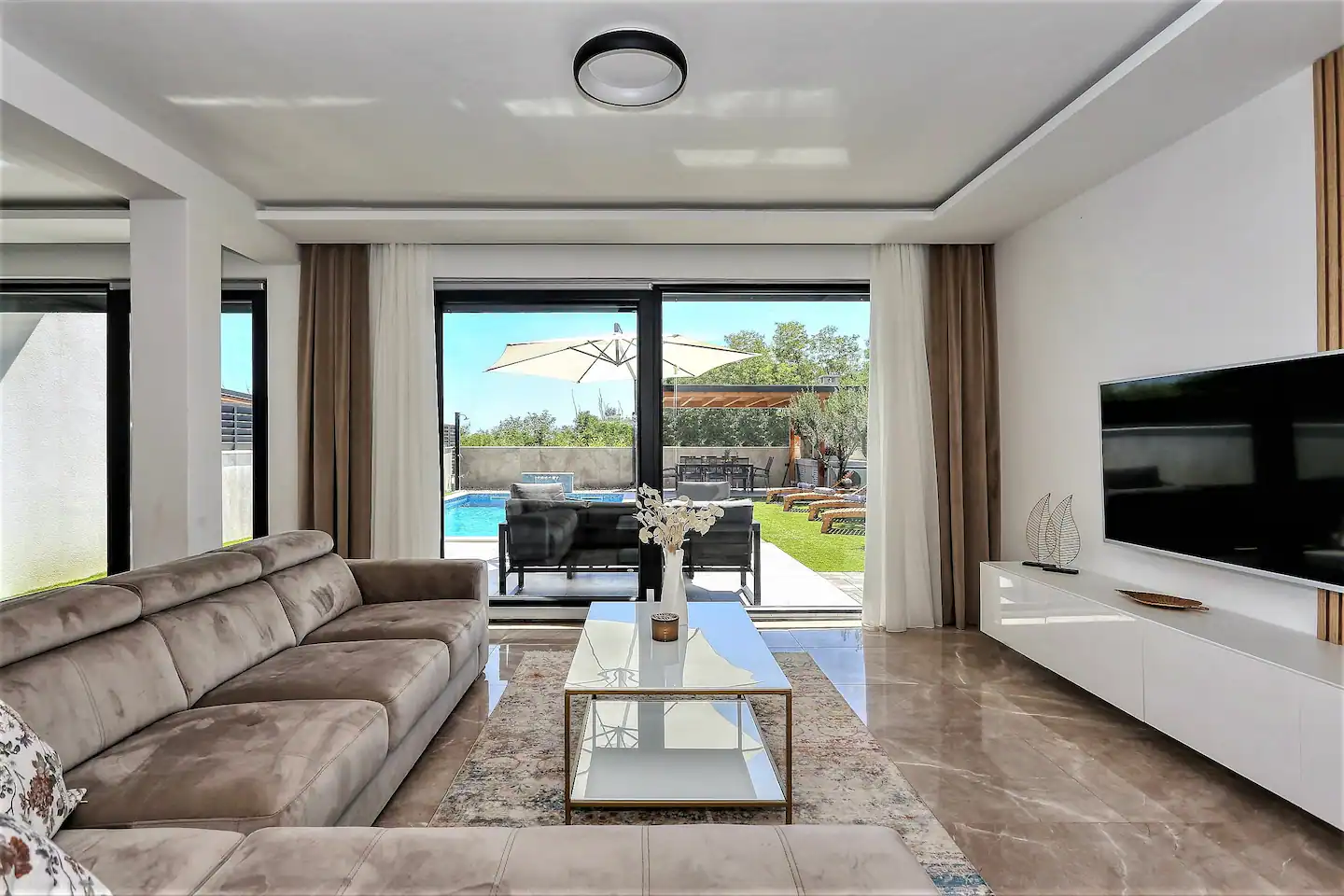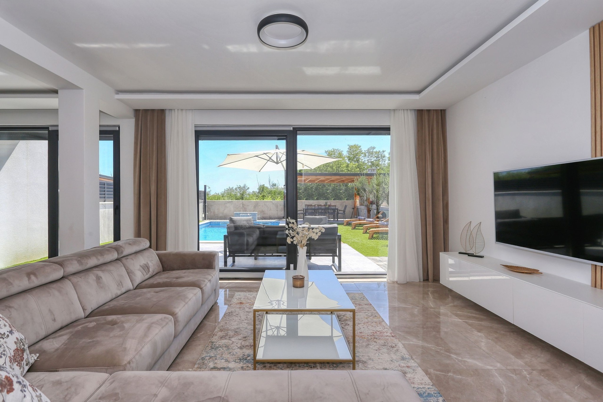 U prizemlju je klimatizirani dnevni boravak, blagovaonica i moderna kuhinja u otvorenom konceptu, kupaonica te spavaća soba s odvojenim ležajevima, smart TV-om i klimom. Na katu se nalaze četiri spavaće sobe, od kojih dvije imaju privatne kupaonice. Ukupno su četiri kupaonice – tri s walk-in tušem i jedna s kadom. Sve sobe opremljene su tapeciranim krevetima, ormarima, smart TV-om, klima uređajem i električnim roletama. Dvije sobe imaju izlaz na prostranu terasu (20 m²) s pogledom na bazen i more, južne orijentacije.