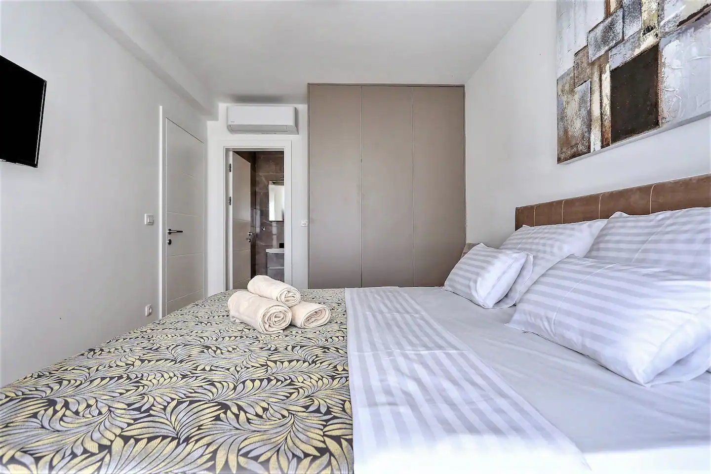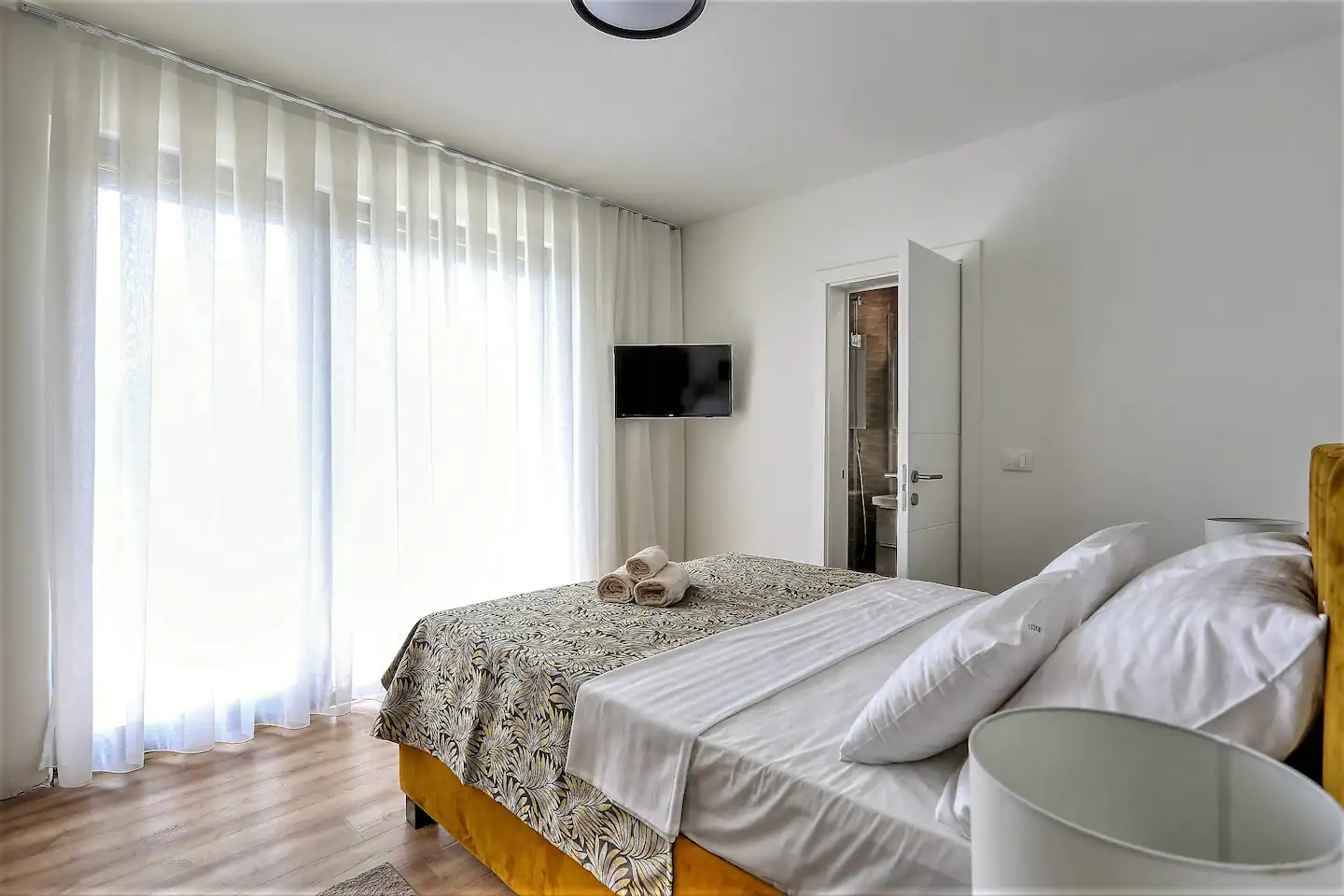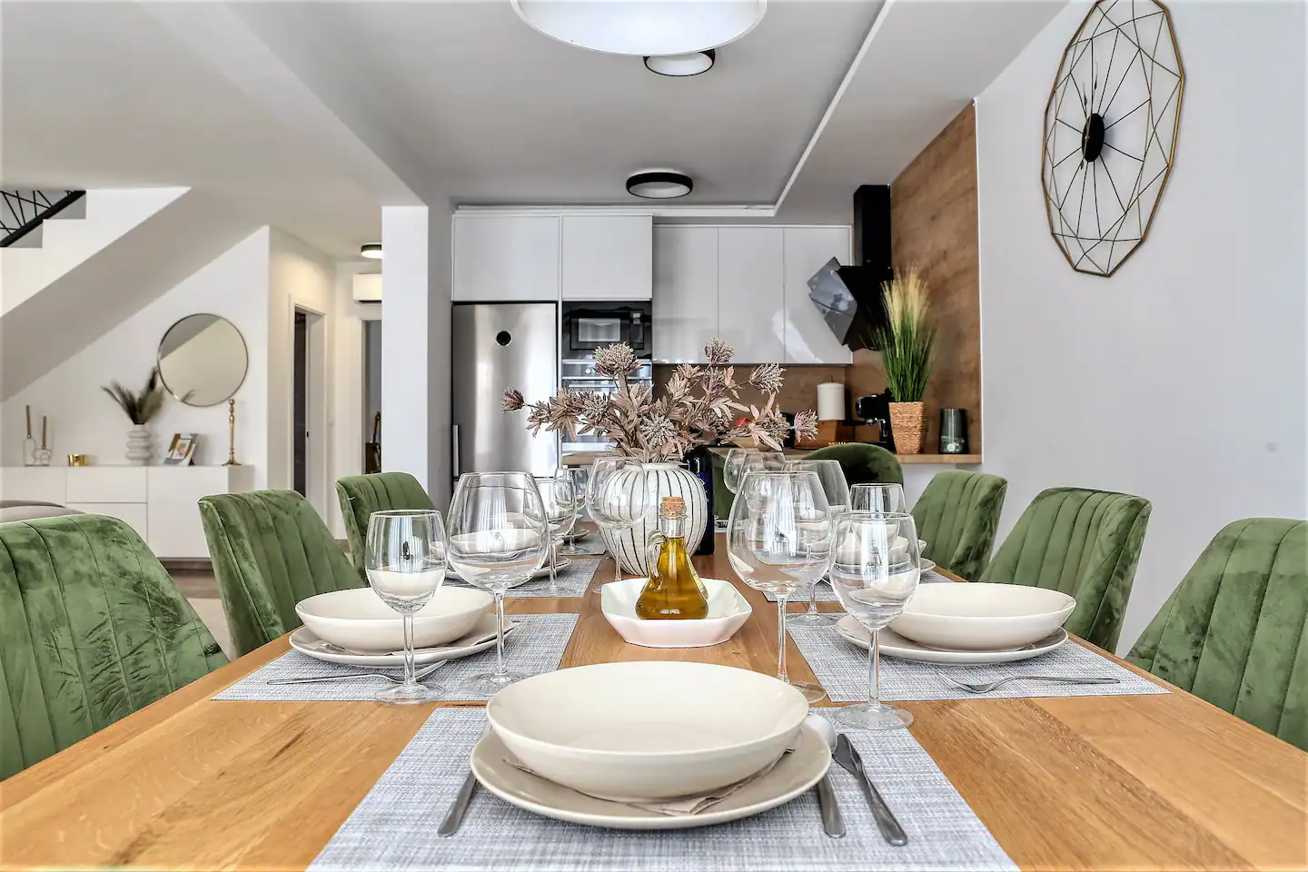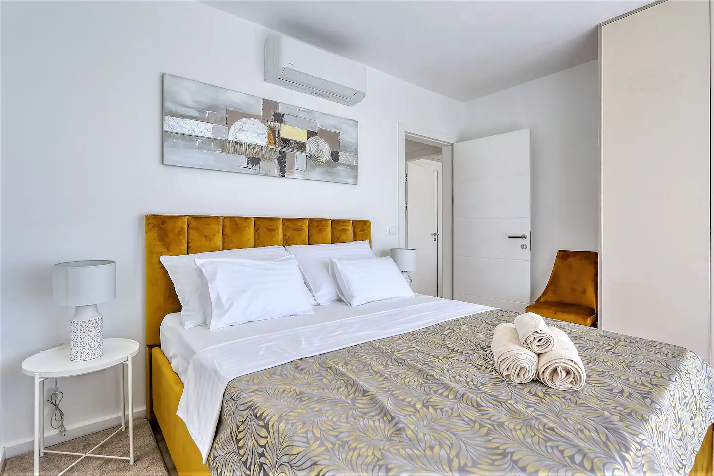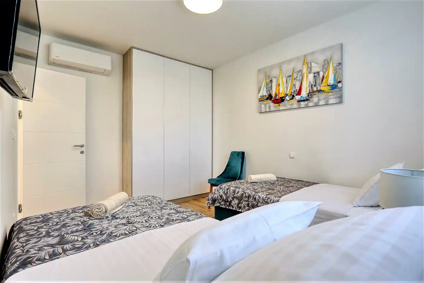 U prizemlju je klimatizirani dnevni boravak, blagovaonica i moderna kuhinja u otvorenom konceptu, kupaonica te spavaća soba s odvojenim ležajevima, smart TV-om i klimom. Na katu se nalaze četiri spavaće sobe, od kojih dvije imaju privatne kupaonice. Ukupno su četiri kupaonice – tri s walk-in tušem i jedna s kadom. Sve sobe opremljene su tapeciranim krevetima, ormarima, smart TV-om, klima uređajem i električnim roletama. Dvije sobe imaju izlaz na prostranu terasu (20 m²) s pogledom na bazen i more, južne orijentacije.