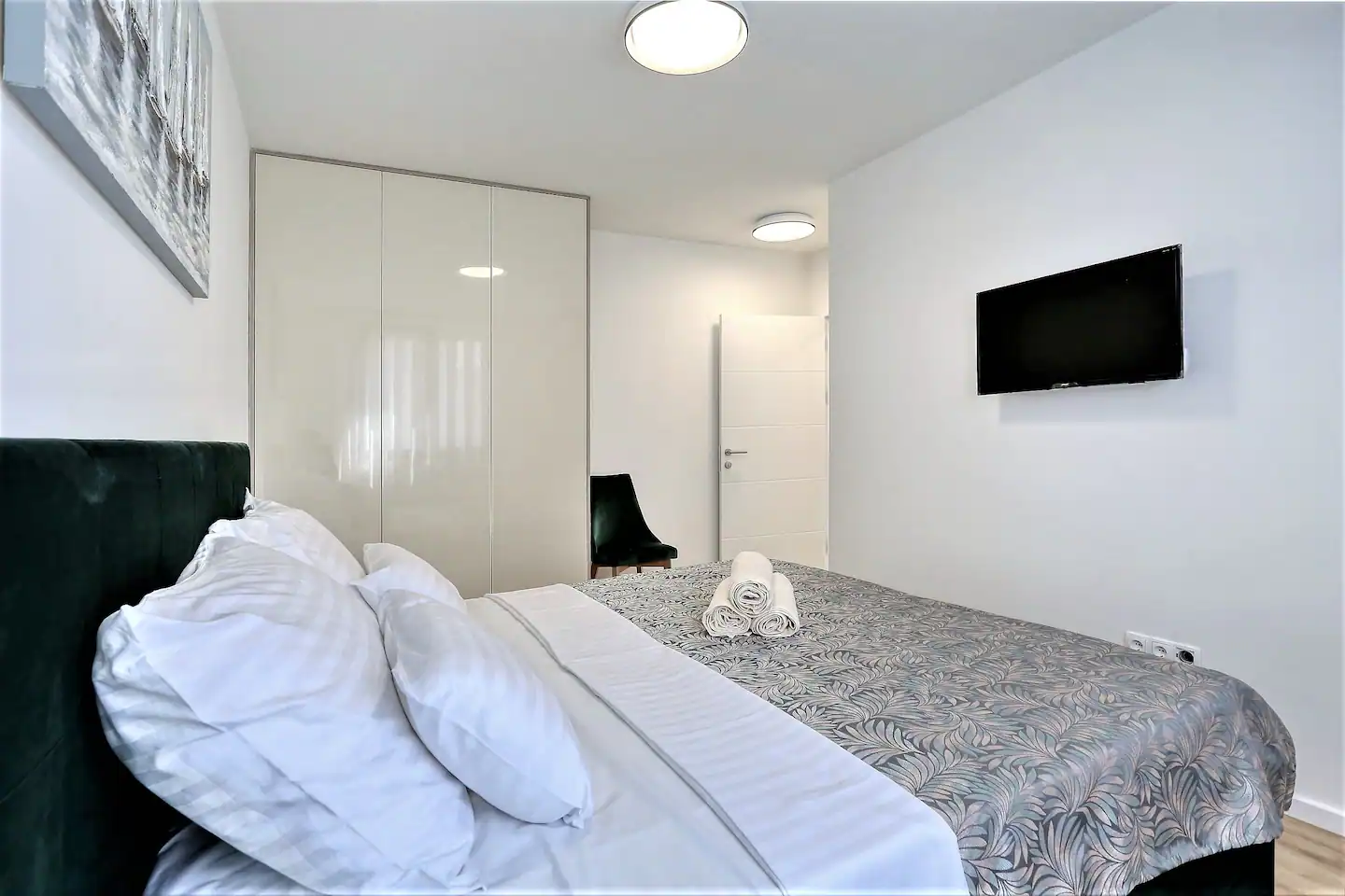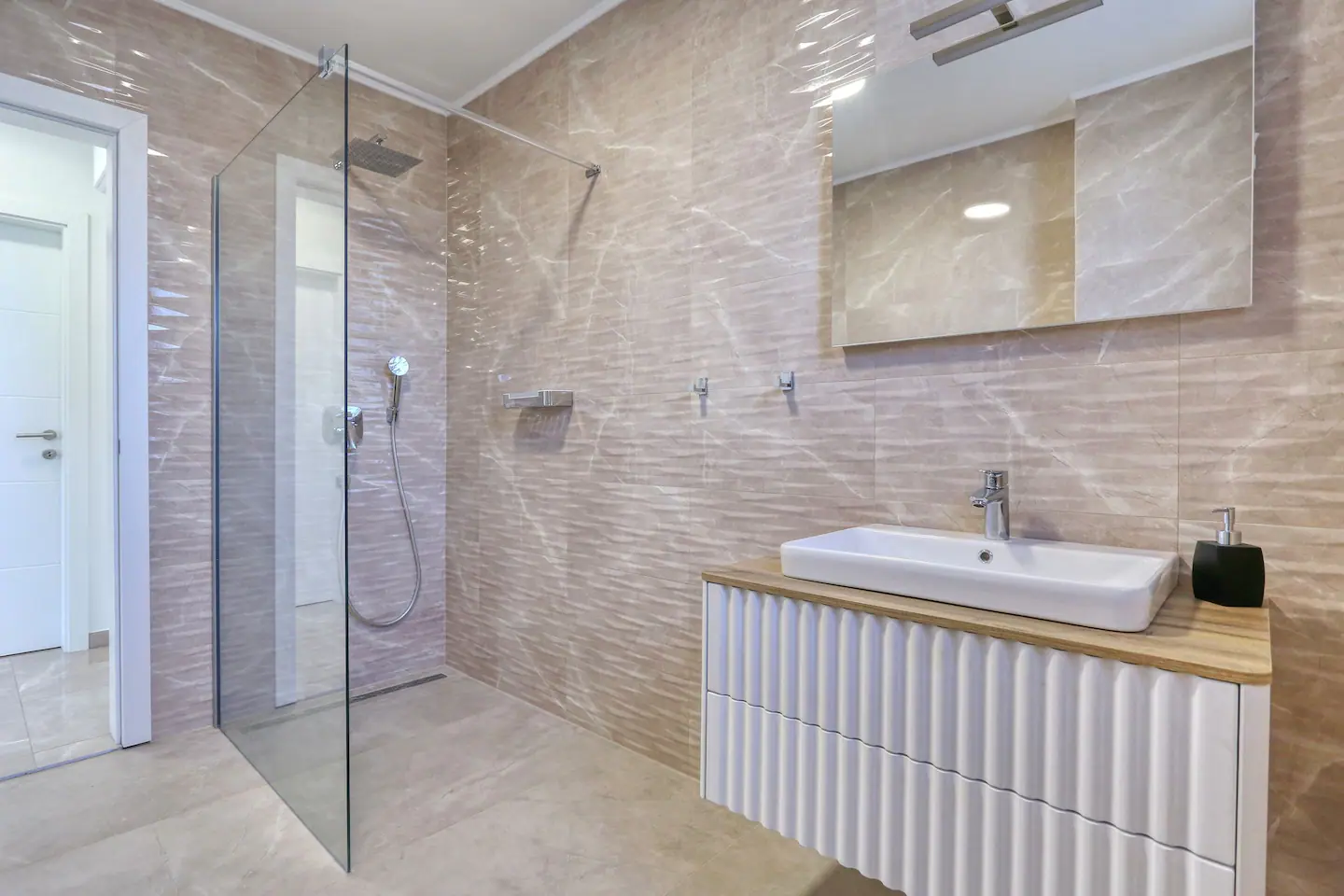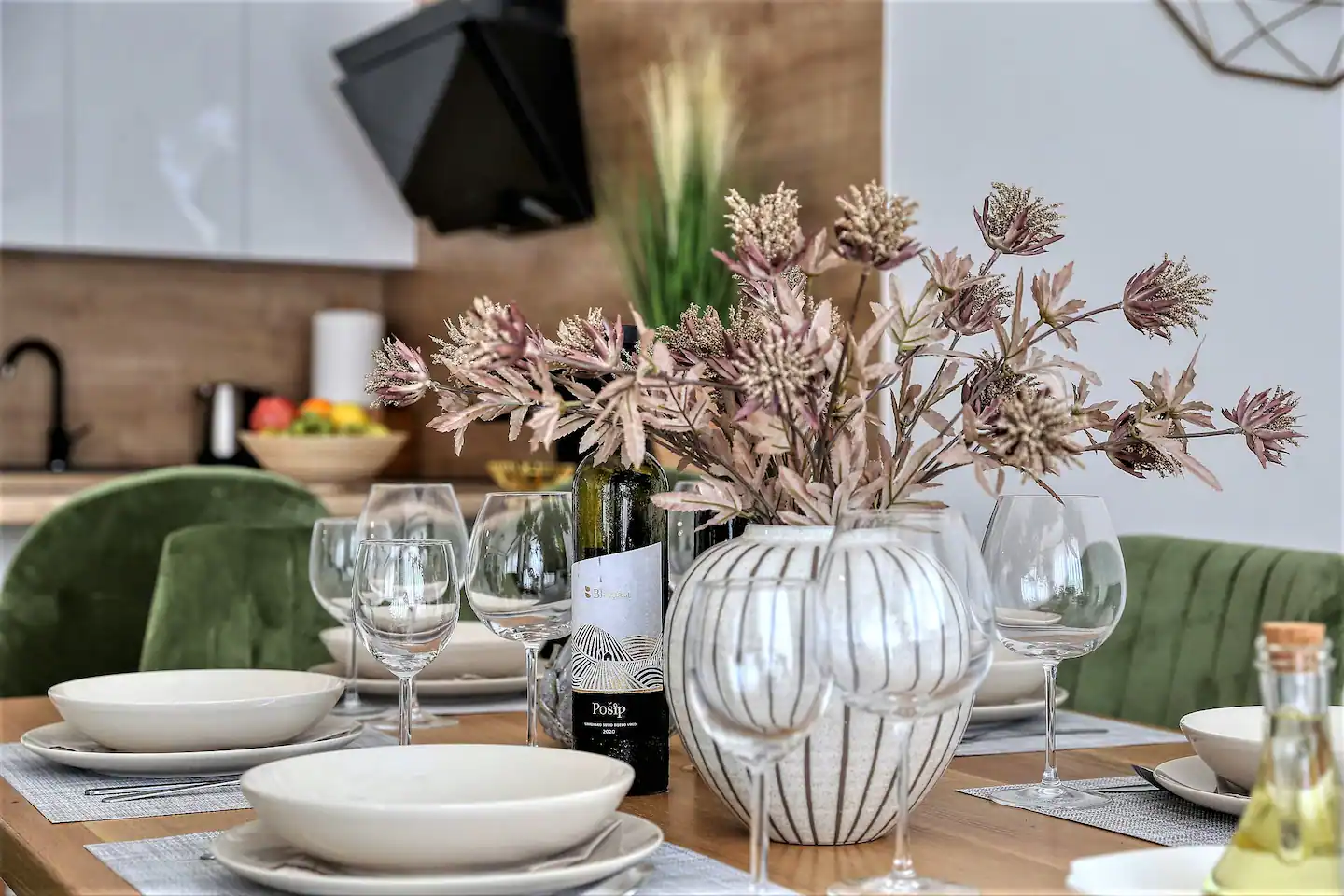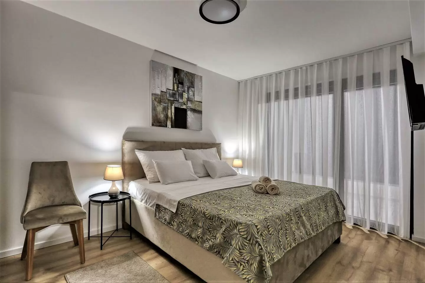 U prizemlju je klimatizirani dnevni boravak, blagovaonica i moderna kuhinja u otvorenom konceptu, kupaonica te spavaća soba s odvojenim ležajevima, smart TV-om i klimom. Na katu se nalaze četiri spavaće sobe, od kojih dvije imaju privatne kupaonice. Ukupno su četiri kupaonice – tri s walk-in tušem i jedna s kadom. Sve sobe opremljene su tapeciranim krevetima, ormarima, smart TV-om, klima uređajem i električnim roletama. Dvije sobe imaju izlaz na prostranu terasu (20 m²) s pogledom na bazen i more, južne orijentacije.