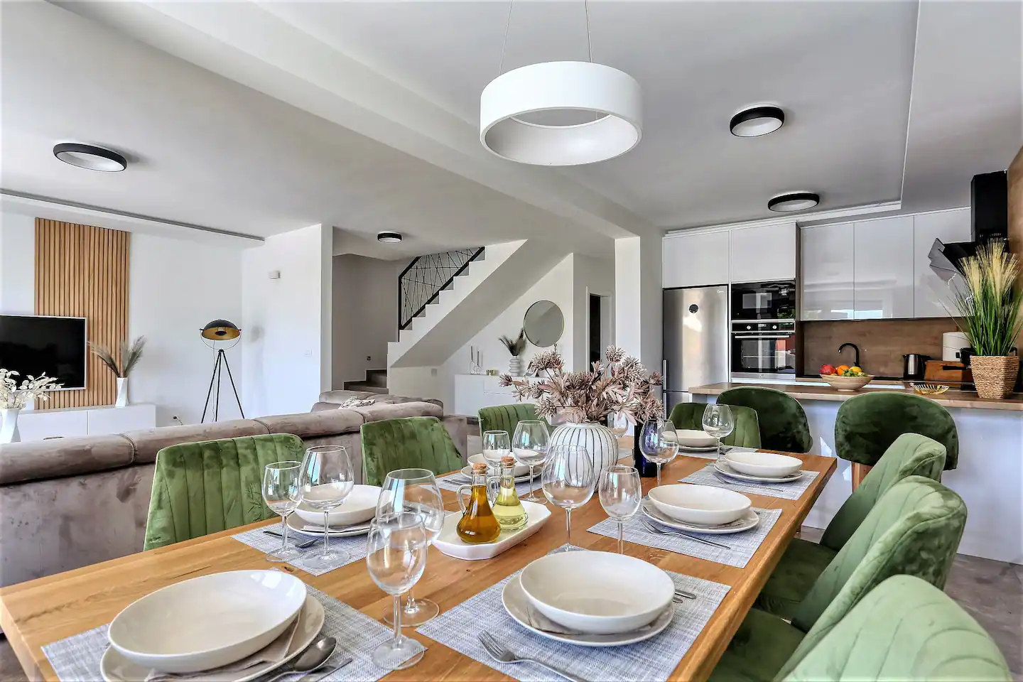 On the ground floor of the house there is a spacious air-conditioned living room, a dining room and a modern equipped kitchen that form one beautiful open space, also a bathroom and one bedroom equipped with two separate beds, a wardrobe, smart TV and air conditioning.
